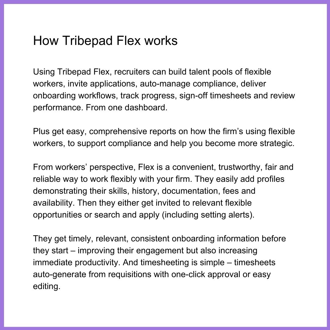 Tribepad Flex is like the ATS you use for your permanent, traditional workforce but for flexible workers. That is, it’s a single system to hire, onboard, manage, review, and manage compliance for flexible workers.