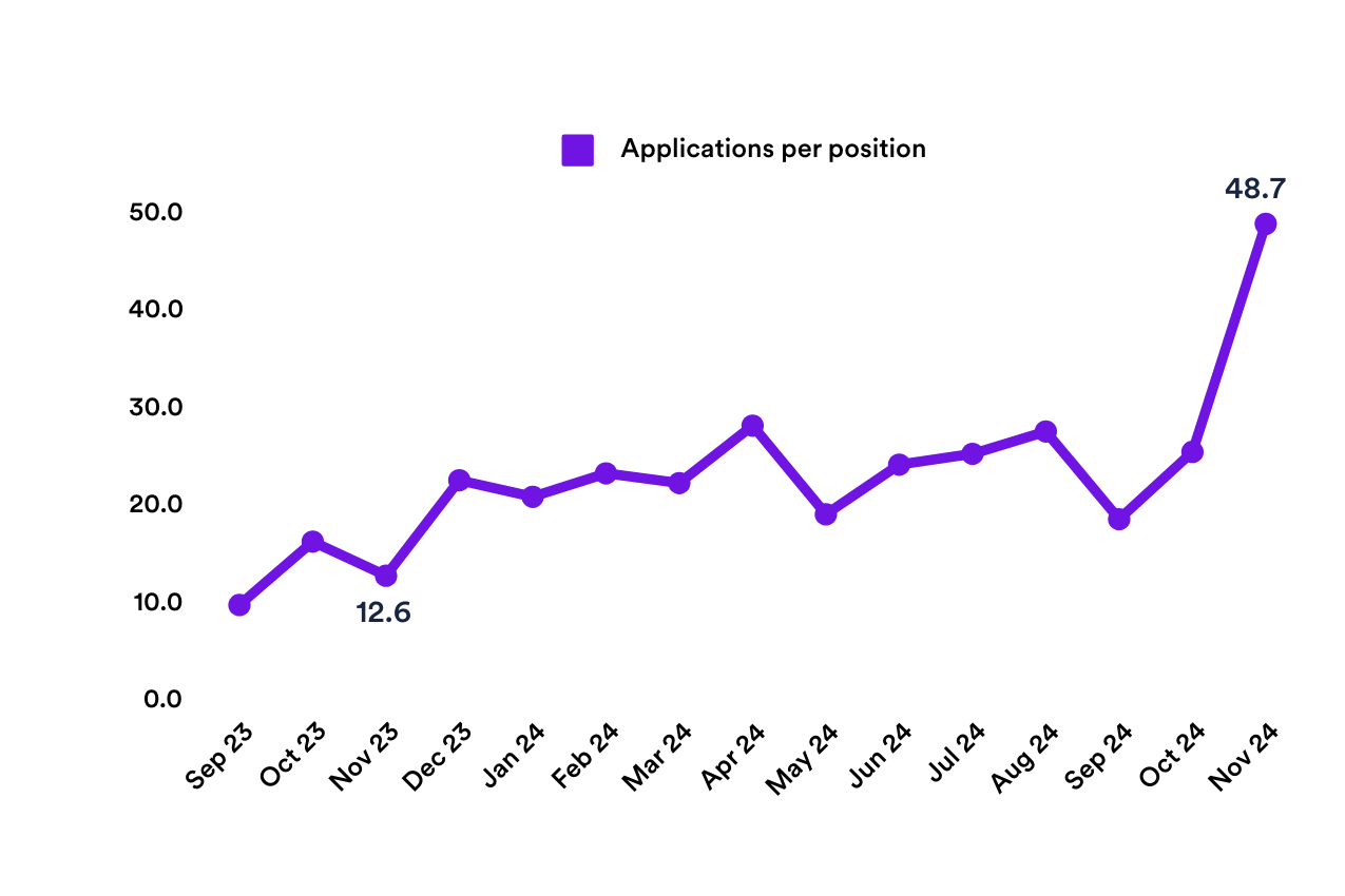 - Applications per vacancy hit a new high – on average, there were 48.7 applications per job in November 2024—a striking increase from previous months. This figure represents a staggering 286% rise in applications per job compared to November 2023, underscoring the intense competition for roles in today’s labour market.